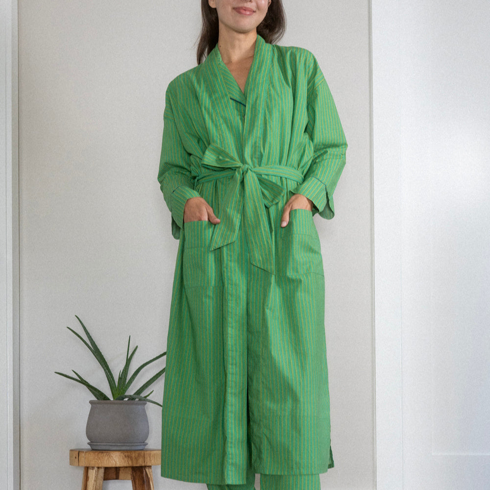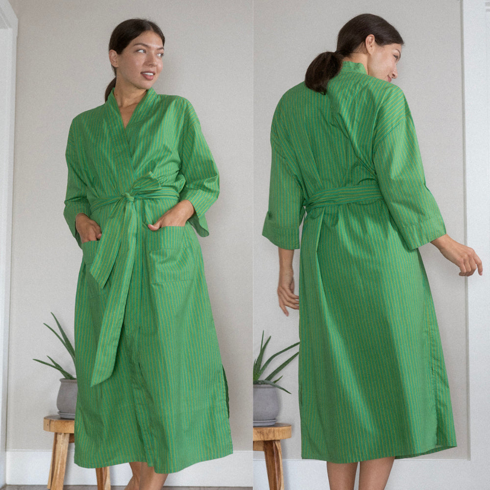 Beauty is a powerful mood enhancer. This bold, joy-splashed robe is made from breezy organic cotton poplin with a vibrant pattern that's screen-printed by hand, so every robe is as unique as you. Peek inside and you’ll find a hidden affirmation stitched into the tag (like "I am enough" or "I am radiant"), giving you a quiet boost with every wear. Oh, and yes—they have pockets. Major win. Wrapped up with a matching fabric pouch and scrunchie, this robe makes a standout gift for anyone who deserves to feel radiant. (That includes you.)